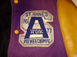 An old-school St. Anne’s hockey jacket crest from mid 70’s Peterborough Church League. The club inexplicably changed their colours to Hab’s colours sometime many years later, the brain fart of someone with a lack of imagination and disregard for tradition in my opinion. Nothing against the Habs but this purple and gold look was pretty cool.