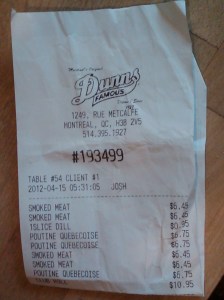 After much searching and walking and frustration, we decided that Moe’s was the Brigadoon of our weekend and off we went back to Dunn’s for a bed time snack. Actually, judging by the timestamp on the receipt in the picture right, I guess it was actually more like breakfast snack. No matter, it tasted good and we hadn’t eaten in hours. When Carrie and I rolled out of the cab at the hotel after Dunn’s, I looked up and commented that it was getting light out and wasn’t that kind of weird?